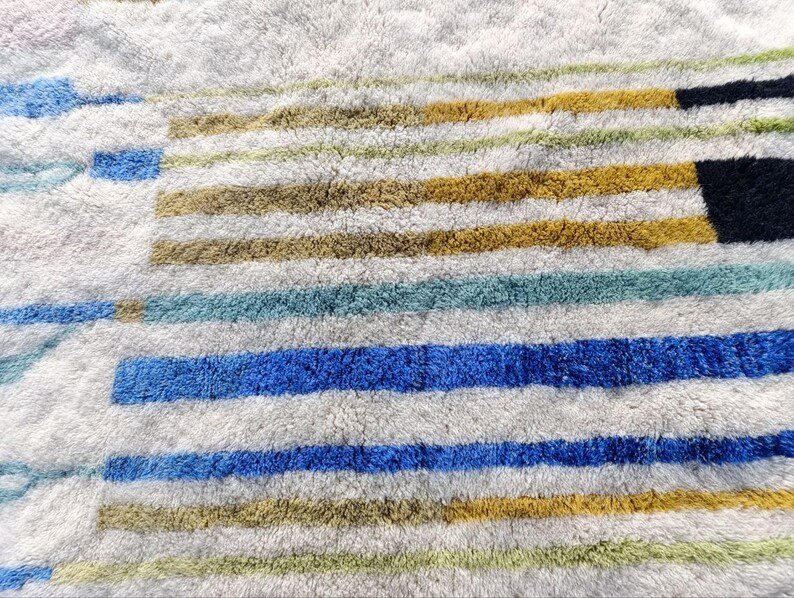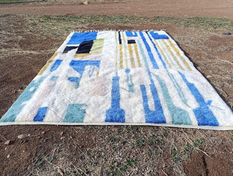 Bring modern Moroccan artistry into your home with this handmade abstract Moroccan rug, crafted in the spirit of traditional Beni Ourain weaving and reimagined with a contemporary design. Featuring a soft ivory base accented with bold geometric shapes and linear patterns in shades of blue, teal, beige, and black, this rug blends tradition with modern elegance.
