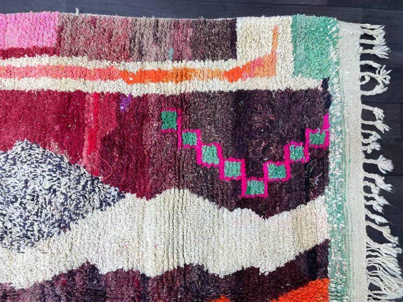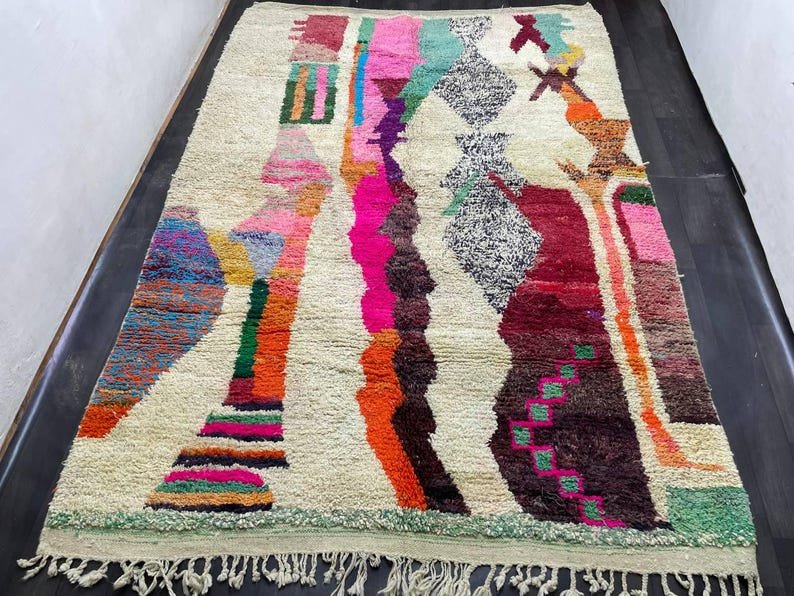 Striking, expressive, and full of movement, this handmade Moroccan Azilal rug features a dramatic abstract composition of flowing vertical forms in rich shades of magenta, teal, rust, charcoal, ivory, and golden ochre. The layered design reflects the spontaneous creativity and storytelling tradition of Berber women weavers.