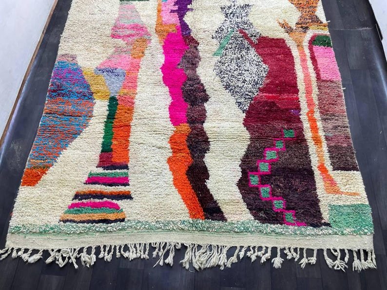 Handwoven in Morocco from 100% natural wool, this rug offers a thick, plush pile that feels soft underfoot while providing excellent durability. Its bold artistic layout makes it an ideal centerpiece for modern living rooms, creative studios, galleries, and bohemian interiors that celebrate color and handcrafted design.