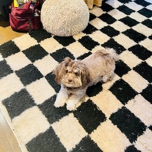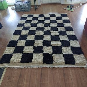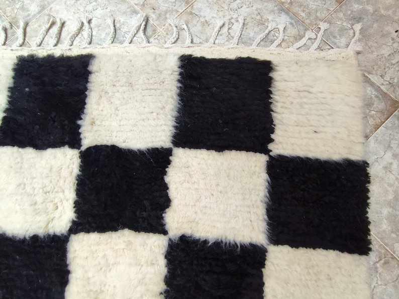 Bold yet timeless, this handmade Moroccan Berber rug features a striking black and ivory checkerboard pattern inspired by traditional Beni Ourain weaving. Its strong geometric design adds structure and contrast while remaining elegant and versatile for modern interiors.