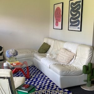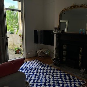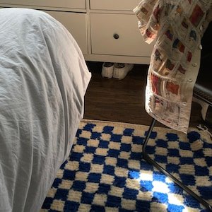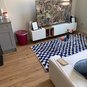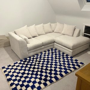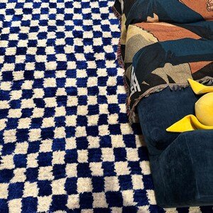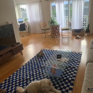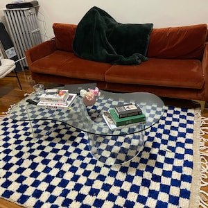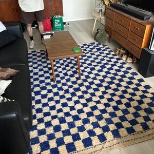 Clean, graphic, and effortlessly modern, this handmade Moroccan Berber rug features a striking geometric checker pattern in deep blue and soft ivory. Inspired by classic Beni Ourain weaving, this rug brings structure, contrast, and warmth to contemporary interiors.
