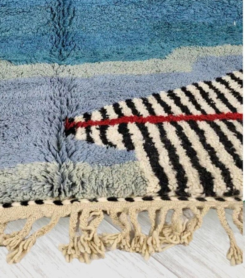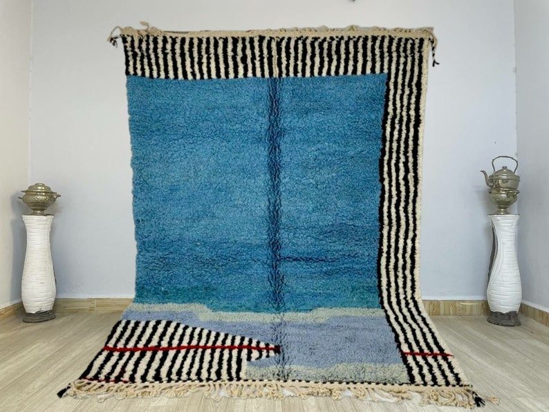 Add calm, depth, and character to your space with this handmade Moroccan wool rug, featuring a rich blue center framed by traditional black-and-white Berber stripes. Inspired by classic Beni Ourain weaving, this rug blends minimalist design with authentic Moroccan craftsmanship.