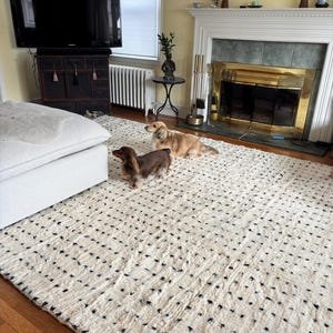 Handwoven in Morocco from 100% natural wool, the rug offers a plush, cozy feel underfoot while maintaining exceptional durability. Its neutral palette and organic pattern make it ideal for modern, Scandinavian, bohemian, or contemporary spaces, blending seamlessly into living rooms, bedrooms, and serene interiors.
