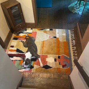 Handwoven in Morocco from 100% natural wool, this rug offers a soft yet durable texture, perfect for everyday living while making a powerful visual statement. Its contemporary abstract design makes it ideal for modern living rooms, bohemian interiors, creative studios, and eclectic spaces that celebrate color and craftsmanship.