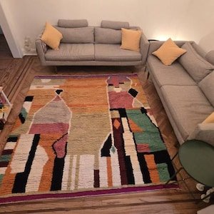 Bold, expressive, and full of movement, this handmade Moroccan Azilal rug is a true piece of woven art. Featuring an energetic mix of terracotta, mustard, blush pink, sage green, black, and ivory, this rug showcases abstract shapes and vertical compositions inspired by Berber symbolism and modern artistic expression.