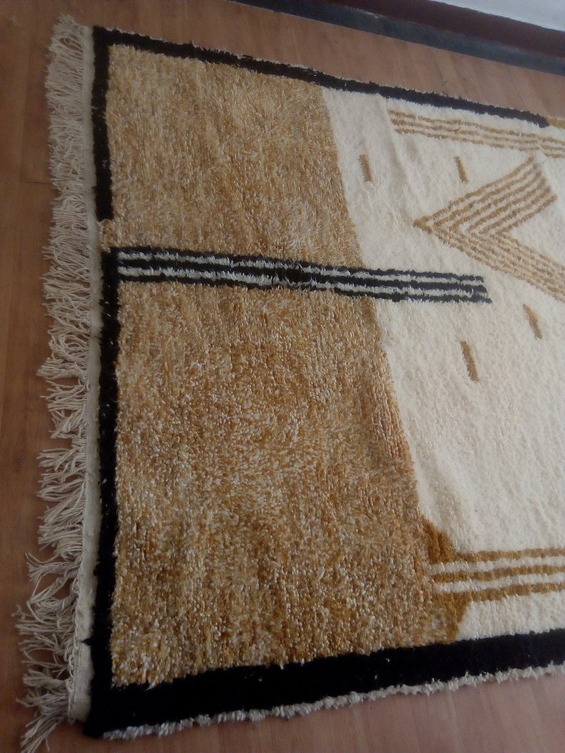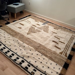 This handmade Beni Ourain Moroccan rug is a striking expression of traditional Berber artistry, blending symbolic geometric motifs with a warm, earthy color palette. Handwoven in Morocco by skilled Berber artisans, this rug reflects generations of craftsmanship rooted in the Atlas Mountains.