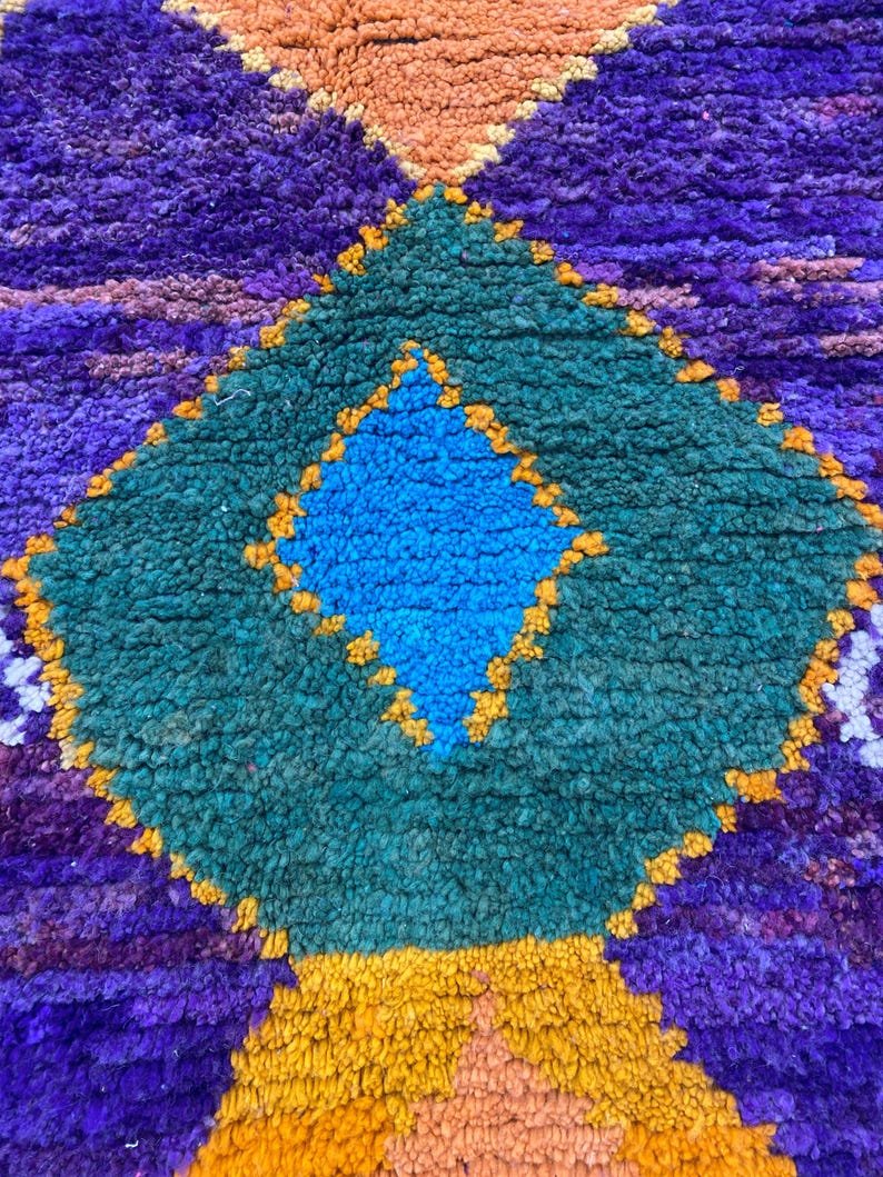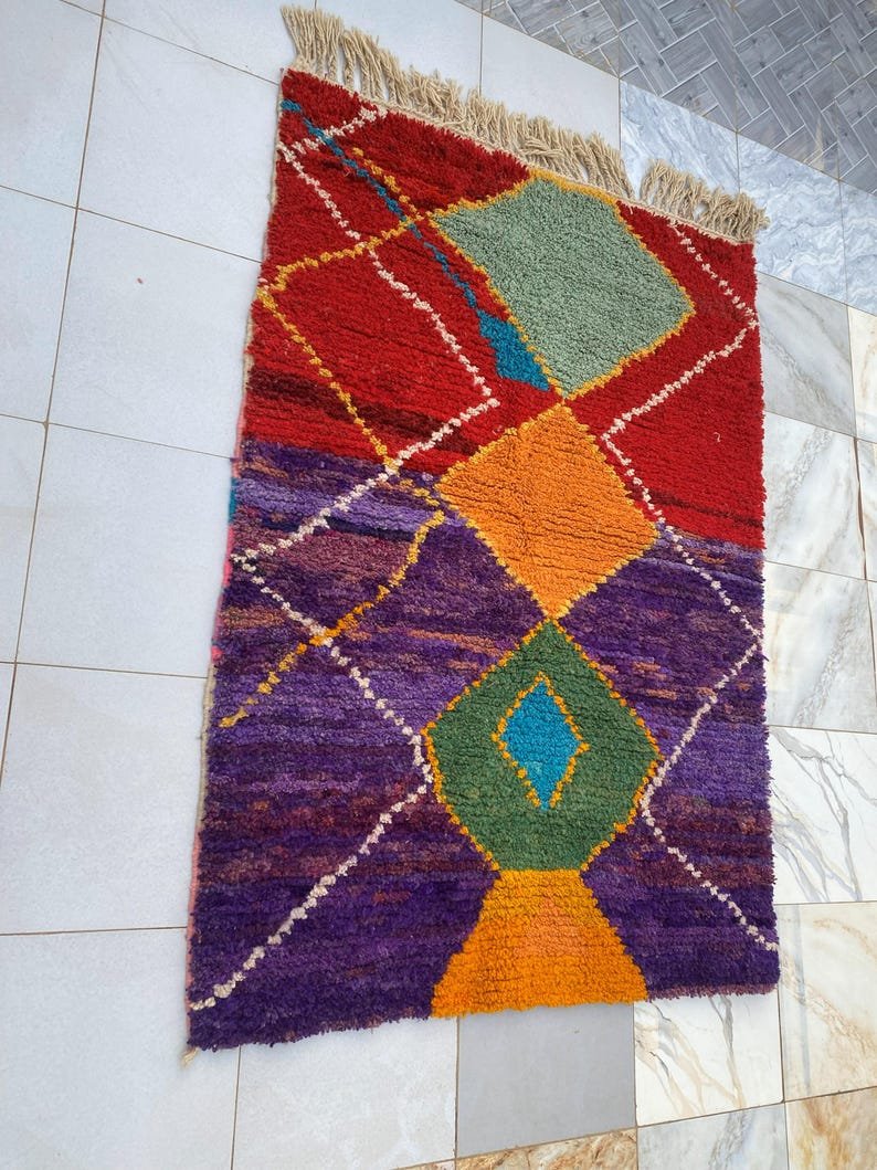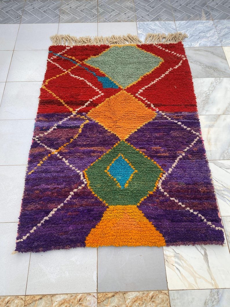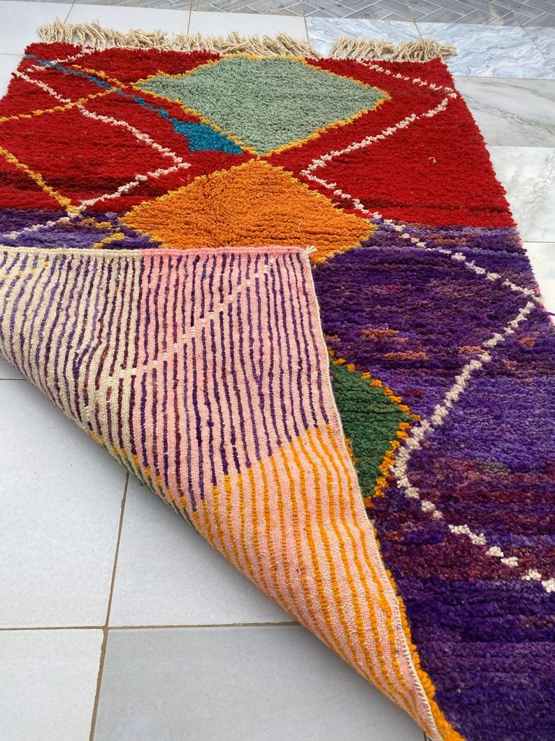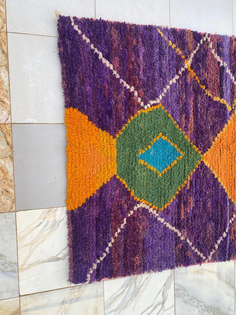 Bring vibrant color and timeless artistry into your home with this handmade Moroccan rug. Featuring a striking geometric design in rich shades of purple, orange, green, and red, this rug instantly becomes a focal point in any room. Expertly crafted from premium wool by skilled Berber artisans, it combines traditional techniques with a modern, abstract aesthetic.