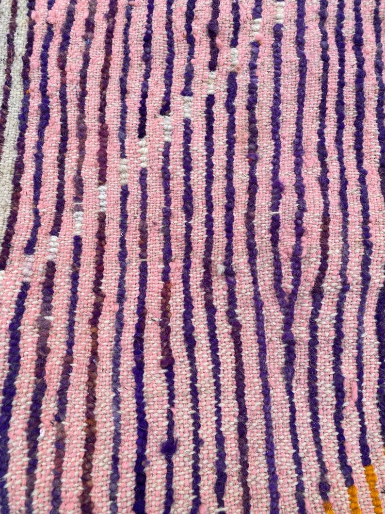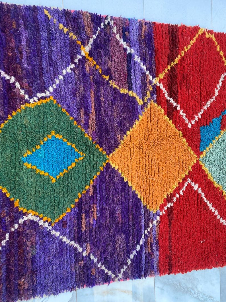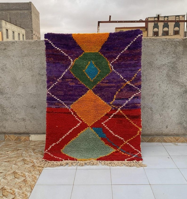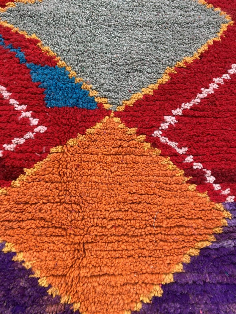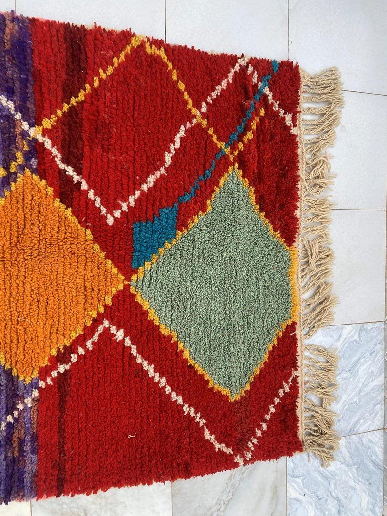 Bring vibrant color and timeless artistry into your home with this handmade Moroccan rug. Featuring a striking geometric design in rich shades of purple, orange, green, and red, this rug instantly becomes a focal point in any room. Expertly crafted from premium wool by skilled Berber artisans, it combines traditional techniques with a modern, abstract aesthetic.