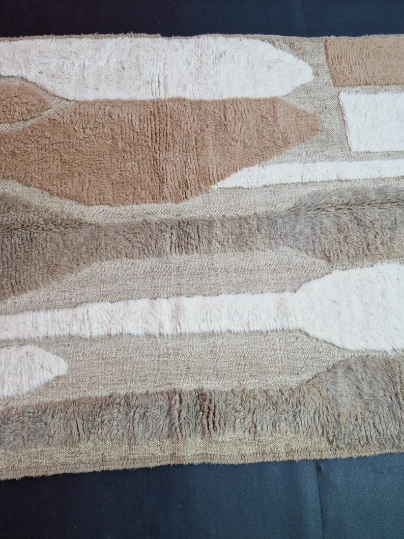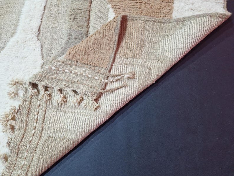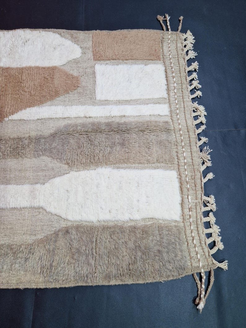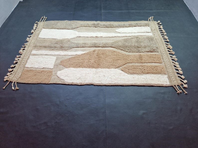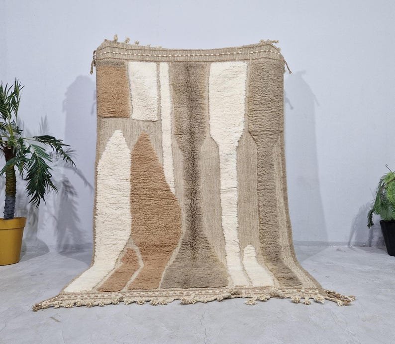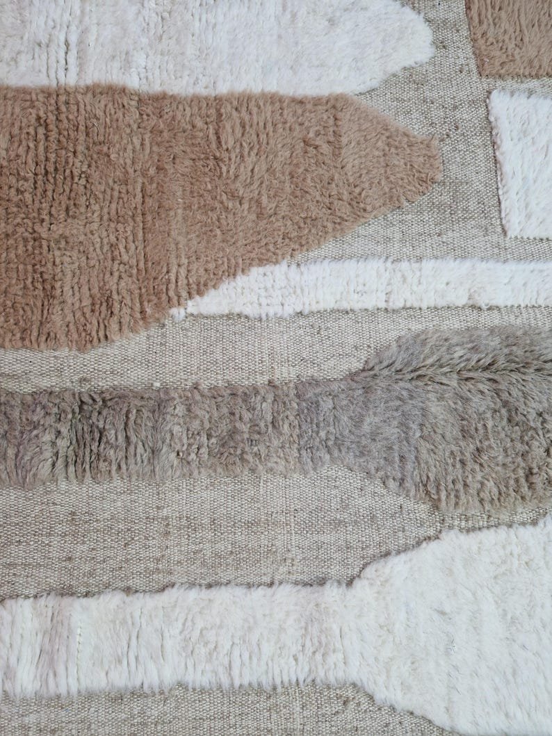 This handmade Moroccan Berber rug features an elegant abstract design in soft beige, taupe, sand, and ivory tones, creating a calm and contemporary look that blends beautifully with modern, minimalist, and organic interiors.
