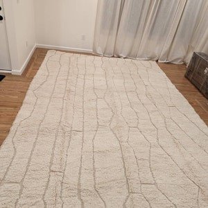 This handmade Moroccan Berber rug features a soft ivory background with subtle, flowing organic line patterns that create gentle movement across the surface. The minimalist design adds texture and warmth without overpowering the space, making it ideal for modern, Scandinavian, and calm boho interiors.