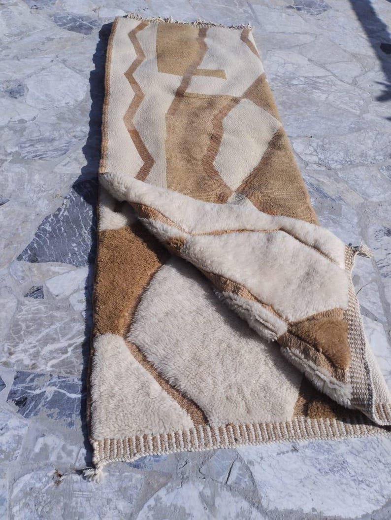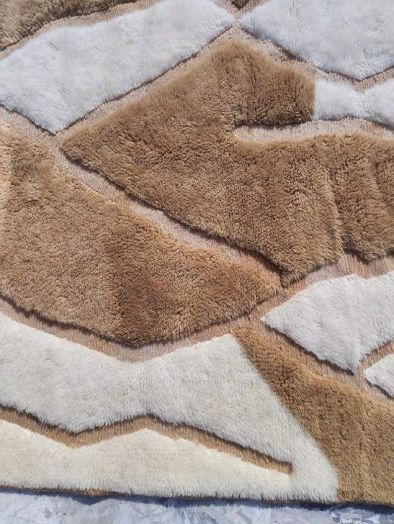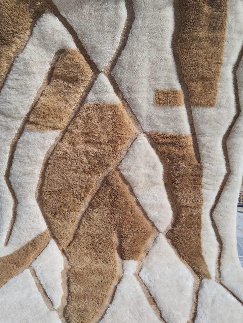 This handmade Moroccan rug features a contemporary abstract design crafted in warm beige and natural brown tones, creating a bold yet soothing statement for modern interiors. The sculpted, high-low pile adds depth and movement, giving the rug a luxurious carved texture that feels as beautiful as it looks.