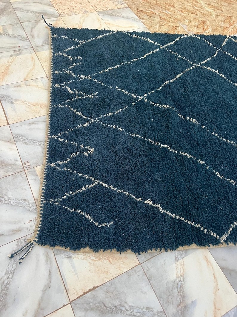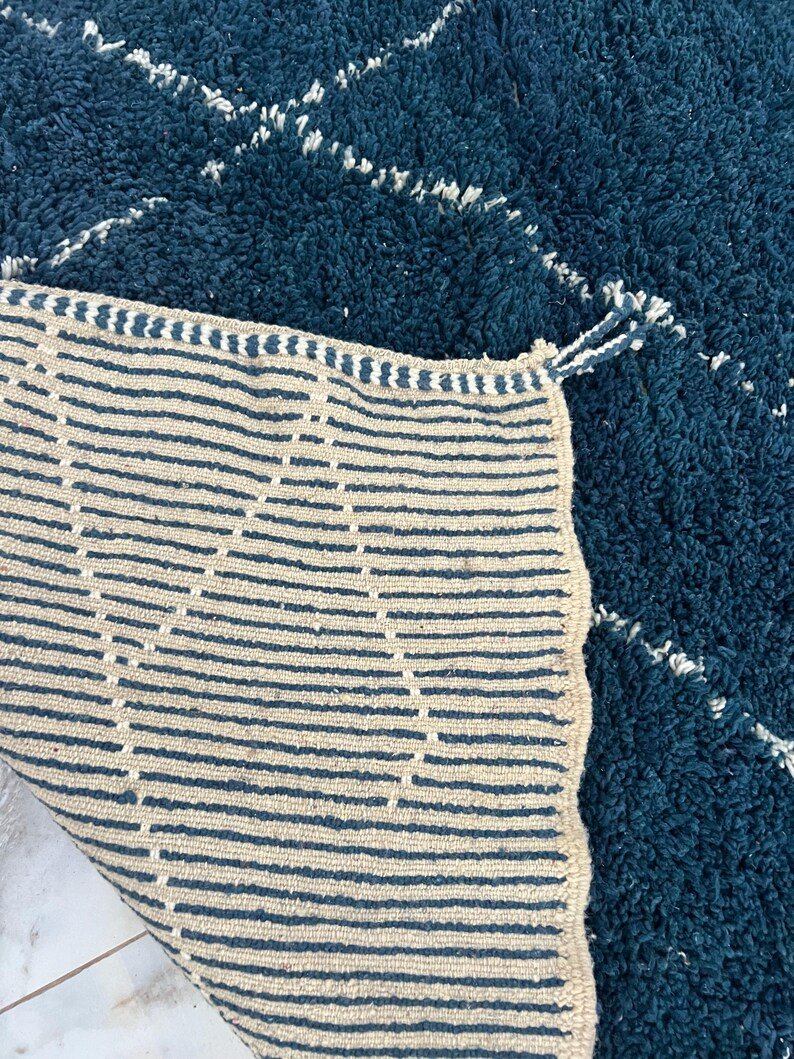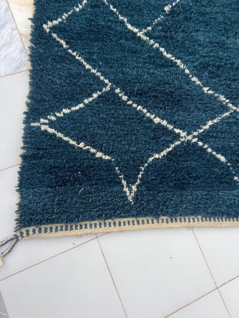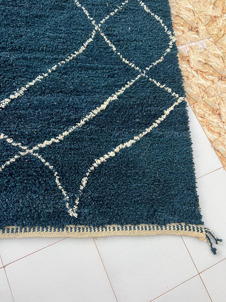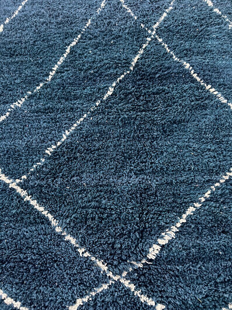 Elevate your interior with this handmade Moroccan rug, expertly woven by skilled Berber artisans using 100% natural wool. Showcasing a deep navy blue tone and the iconic Beni Ourain diamond pattern, this rug beautifully blends traditional Moroccan heritage with modern minimalist style.