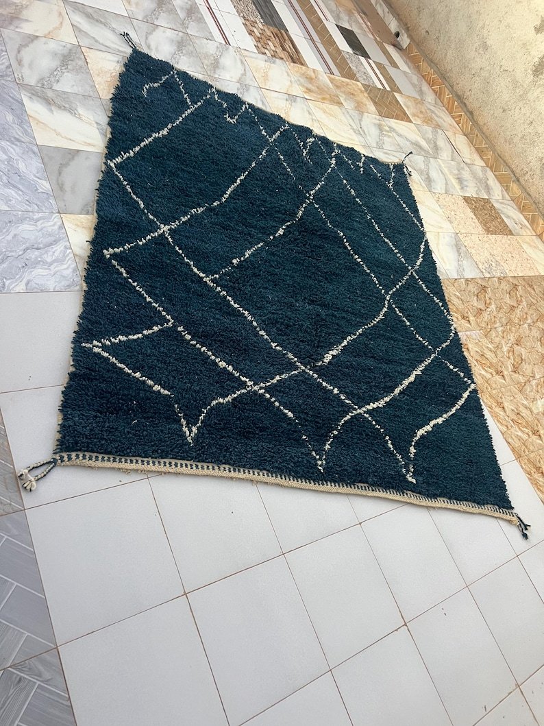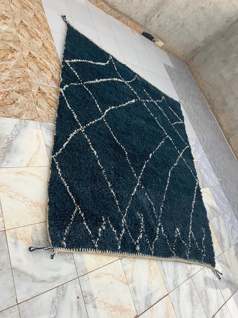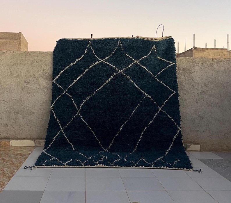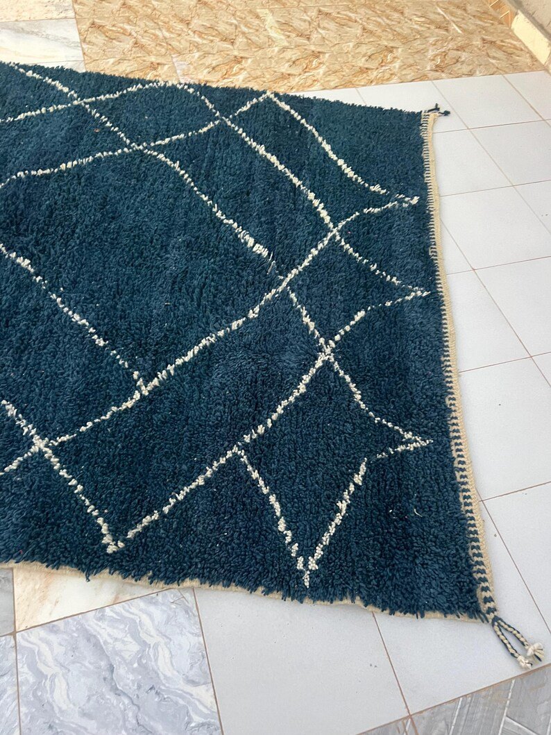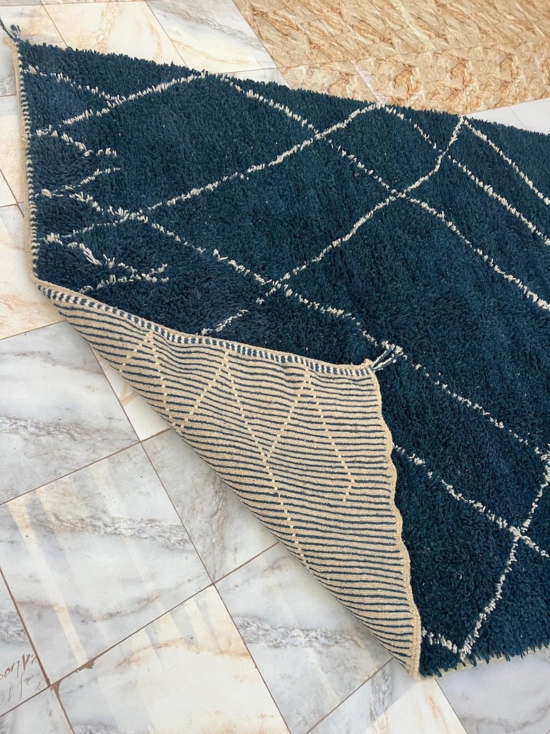 Elevate your interior with this handmade Moroccan rug, expertly woven by skilled Berber artisans using 100% natural wool. Showcasing a deep navy blue tone and the iconic Beni Ourain diamond pattern, this rug beautifully blends traditional Moroccan heritage with modern minimalist style.