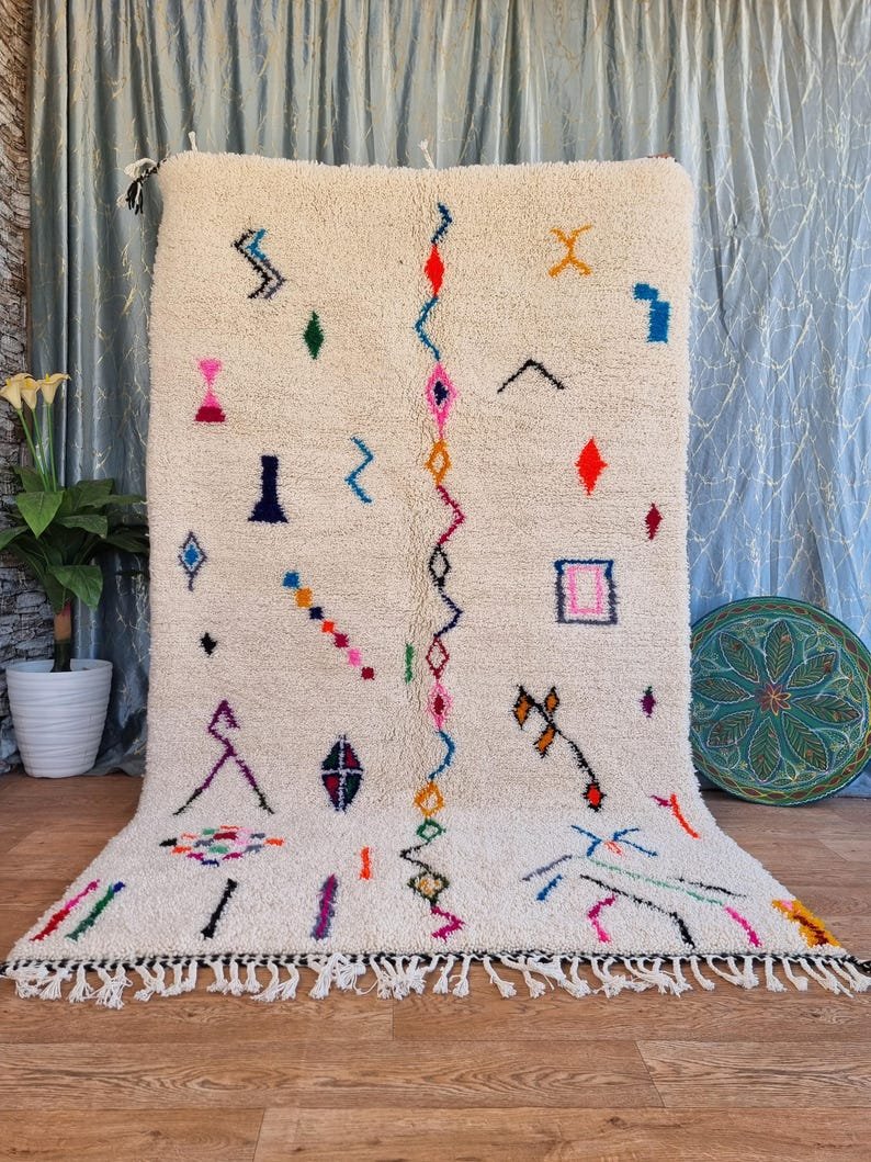 Handwoven in Morocco from 100% natural wool, this rug offers a thick, plush pile that feels soft and cozy underfoot while providing long-lasting durability. Its bright accents over a neutral background make it perfect for modern living rooms, bohemian interiors, creative spaces, and minimalist homes that want a touch of color and culture.