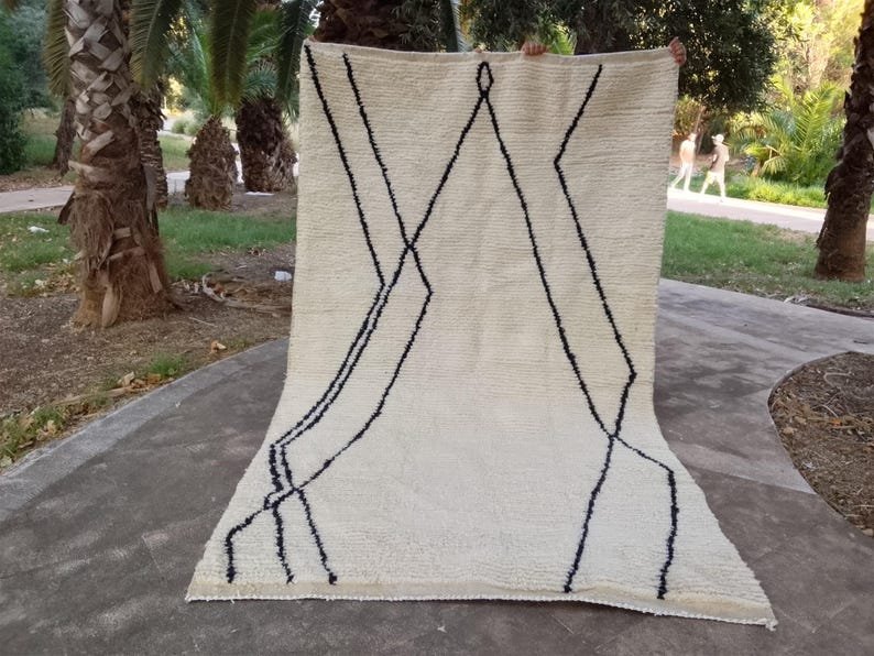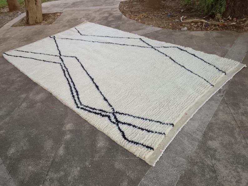 Minimalist Beni Ourain Moroccan Rug – Handmade Wool Area Rug – Ivory Berber Rug with Black Lines