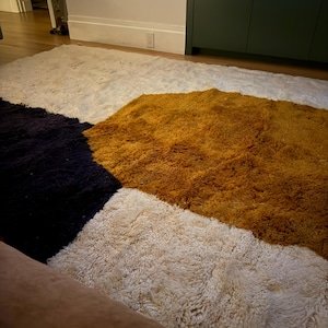 Minimal, warm, and beautifully balanced, this handmade Moroccan Berber rug showcases a modern color-block design inspired by traditional Beni Ourain craftsmanship. Featuring a soft ivory wool base accented with rich mustard and deep navy panels, this rug brings quiet elegance and contemporary character to any interior.