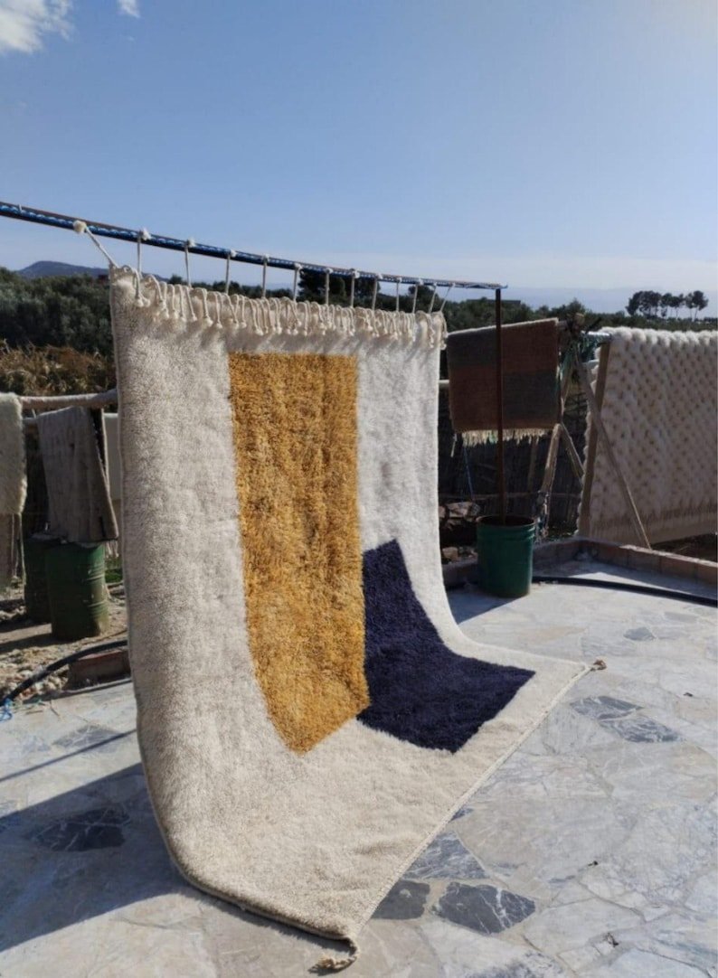 Be the first to review “Minimalist Moroccan Wool Rug – Handmade Berber Area Rug – Color Block Beni Ourain Style – Ivory, Mustard & Navy Rug”