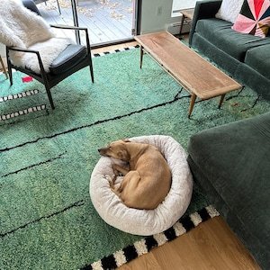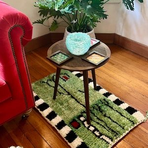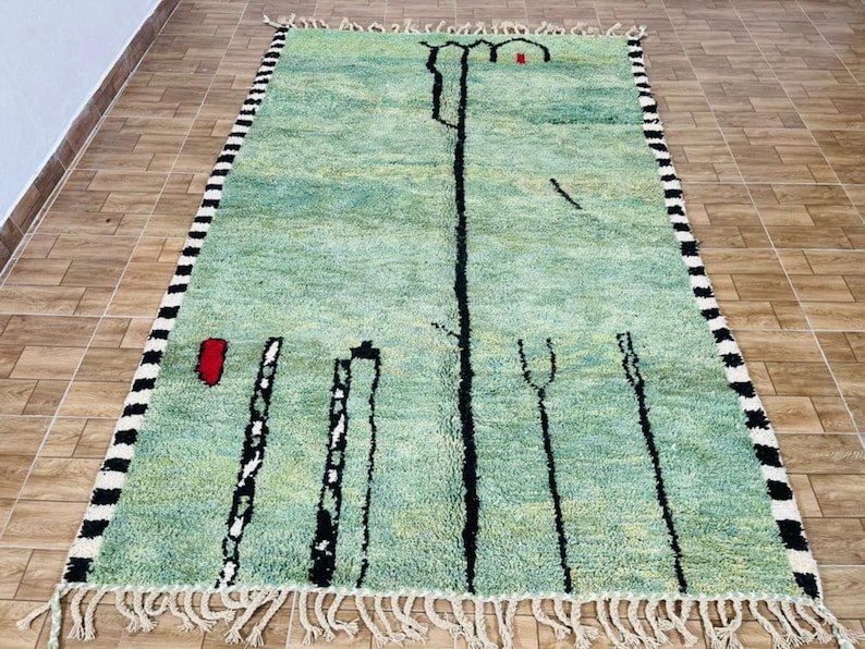 This handmade Moroccan Azilal rug features a refreshing mint-green wool background highlighted with expressive black line work and subtle red accents, creating a calm yet artistic composition inspired by Berber symbolism and modern abstract art.