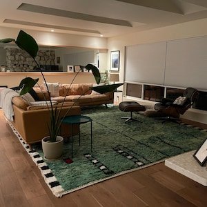 The free-flowing linear design reflects traditional Amazigh storytelling interpreted in a contemporary minimalist style. Each rug is unique, with slight variations in pattern and tone that showcase true handcrafted character. Finished with hand-knotted fringes and bold side borders, this rug blends tribal heritage with modern interior design.