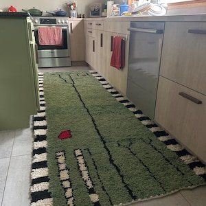 Woven by hand in Morocco using 100% natural wool, this rug offers a soft, medium-thick pile that is comfortable underfoot and suitable for everyday living. The long rectangular shape makes it perfect as a hallway runner, bedroom rug, studio accent, or modern living space statement piece.