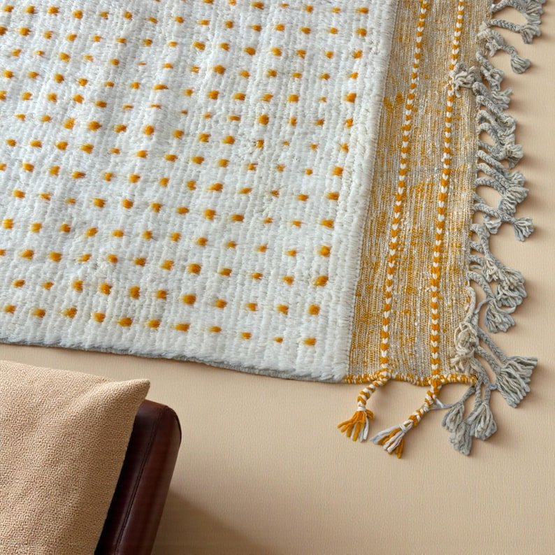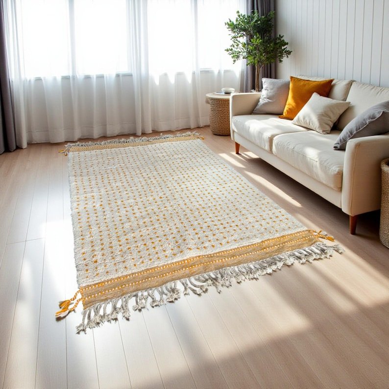 This elegant Moroccan Beni Ourain–style rug is handwoven from 100% natural wool and features a soft ivory base accented with delicate mustard-yellow dotted motifs and decorative woven borders. Its subtle pattern and warm tones make it a perfect fit for both modern and cozy interiors.