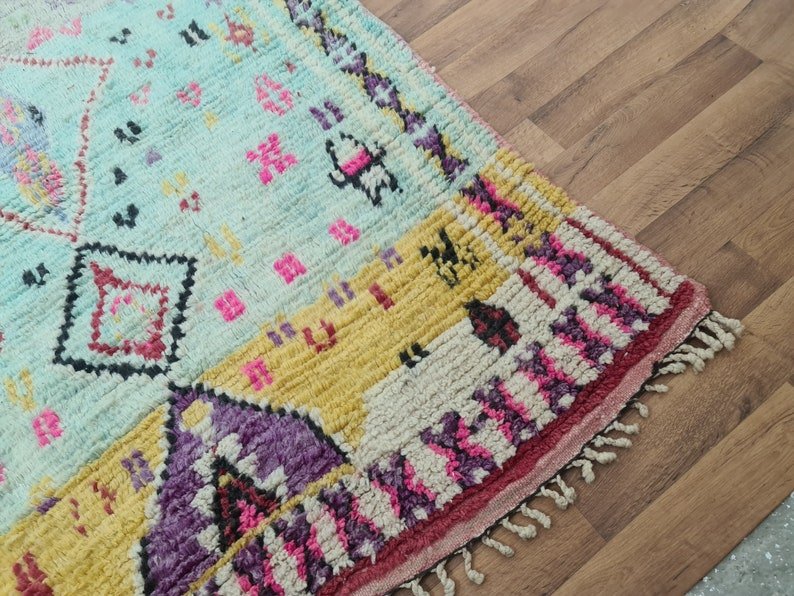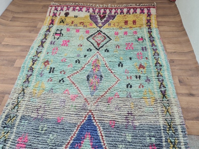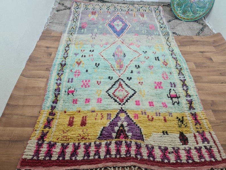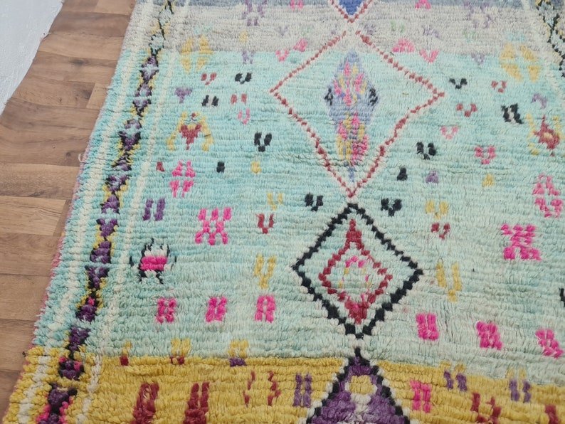 Delicate, artistic, and full of Berber symbolism, this handmade Moroccan Azilal rug features a soothing pastel palette of soft mint, blush pink, lavender, butter yellow, and ivory, arranged in layered geometric diamonds and playful tribal motifs. The balanced composition creates a calm yet expressive piece that brings gentle color and texture into your space.