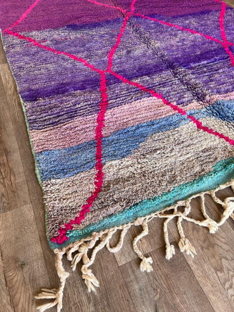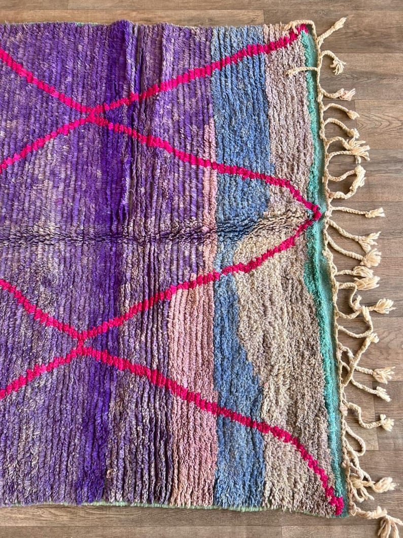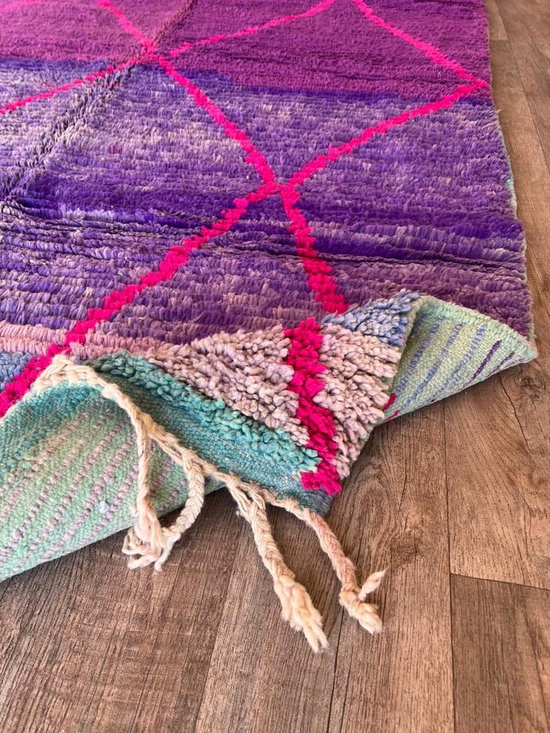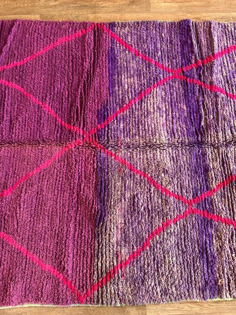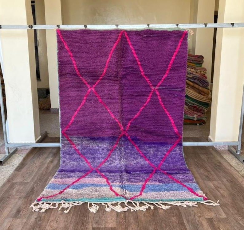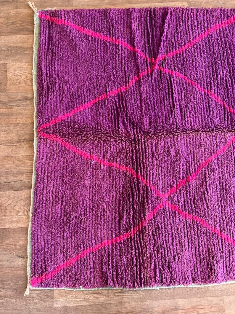 This stunning handmade Moroccan rug features a rich purple wool field accented with bold pink diamond lines, inspired by classic Beni Ourain Berber patterns with a modern, colorful twist.