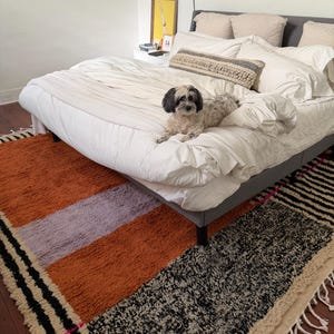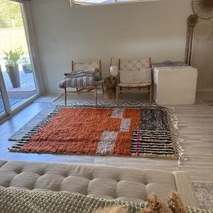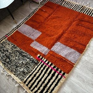 Warm, bold, and artistically balanced, this handmade Moroccan Berber rug features a rich terracotta wool field accented with abstract ivory shapes and framed by striking black-and-white striped borders. A subtle touch of pink detail adds character and highlights its handcrafted charm.